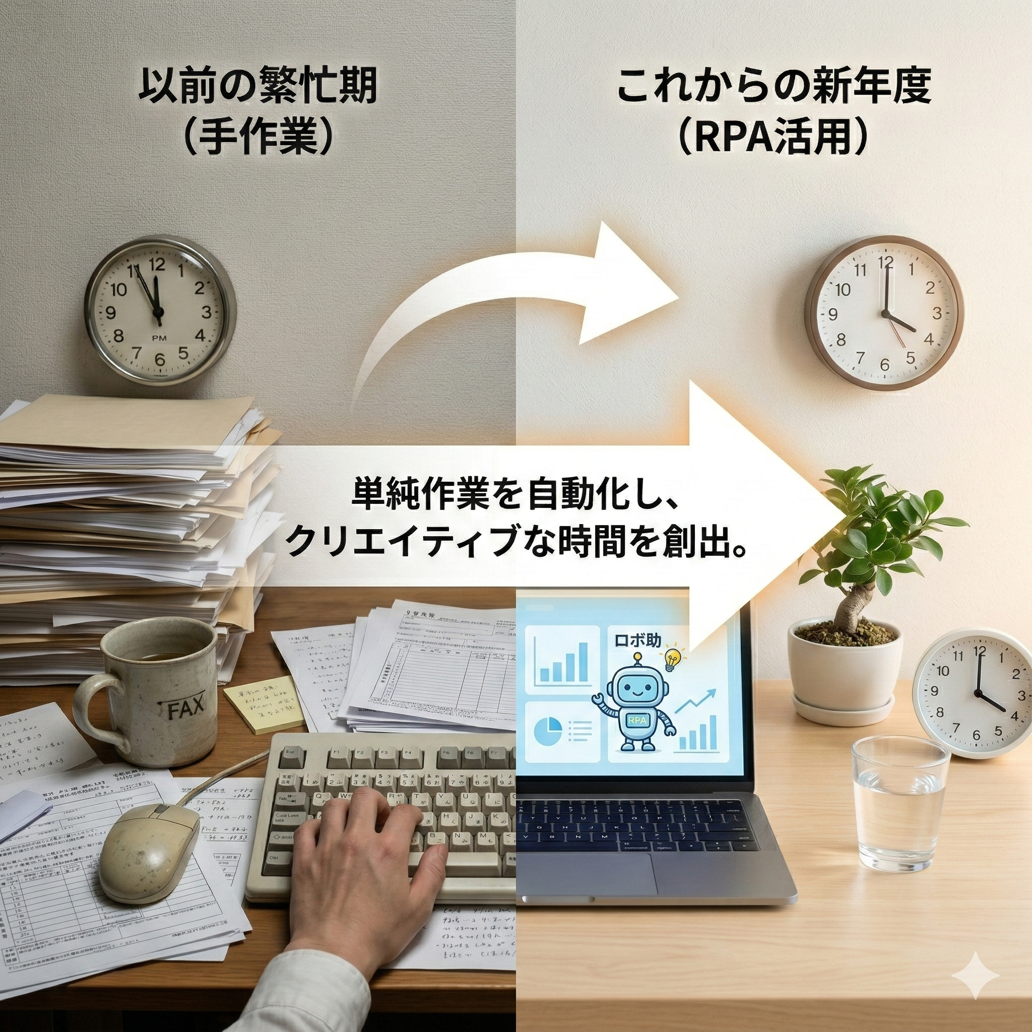 もし、それらの単純作業をテクノロジー(RPAなど)に任せることができたなら。 「来年の今頃は、もっと顧問先の未来に寄り添うクリエイティブな相談に、全員が時間を使えている」。 そんな、少し頼もしい事務所の姿が、想像できませんか?